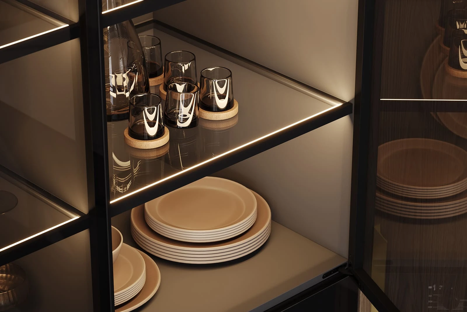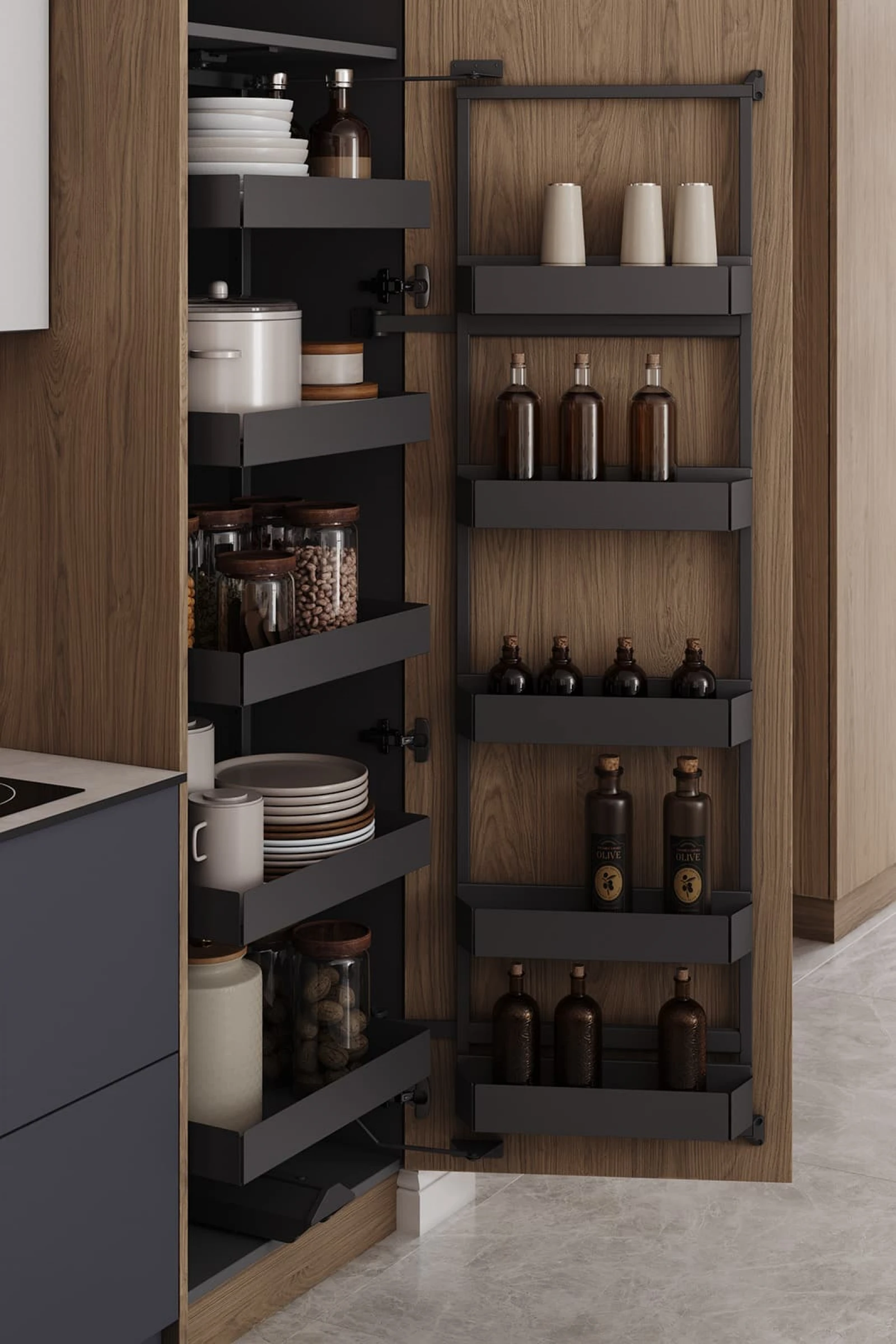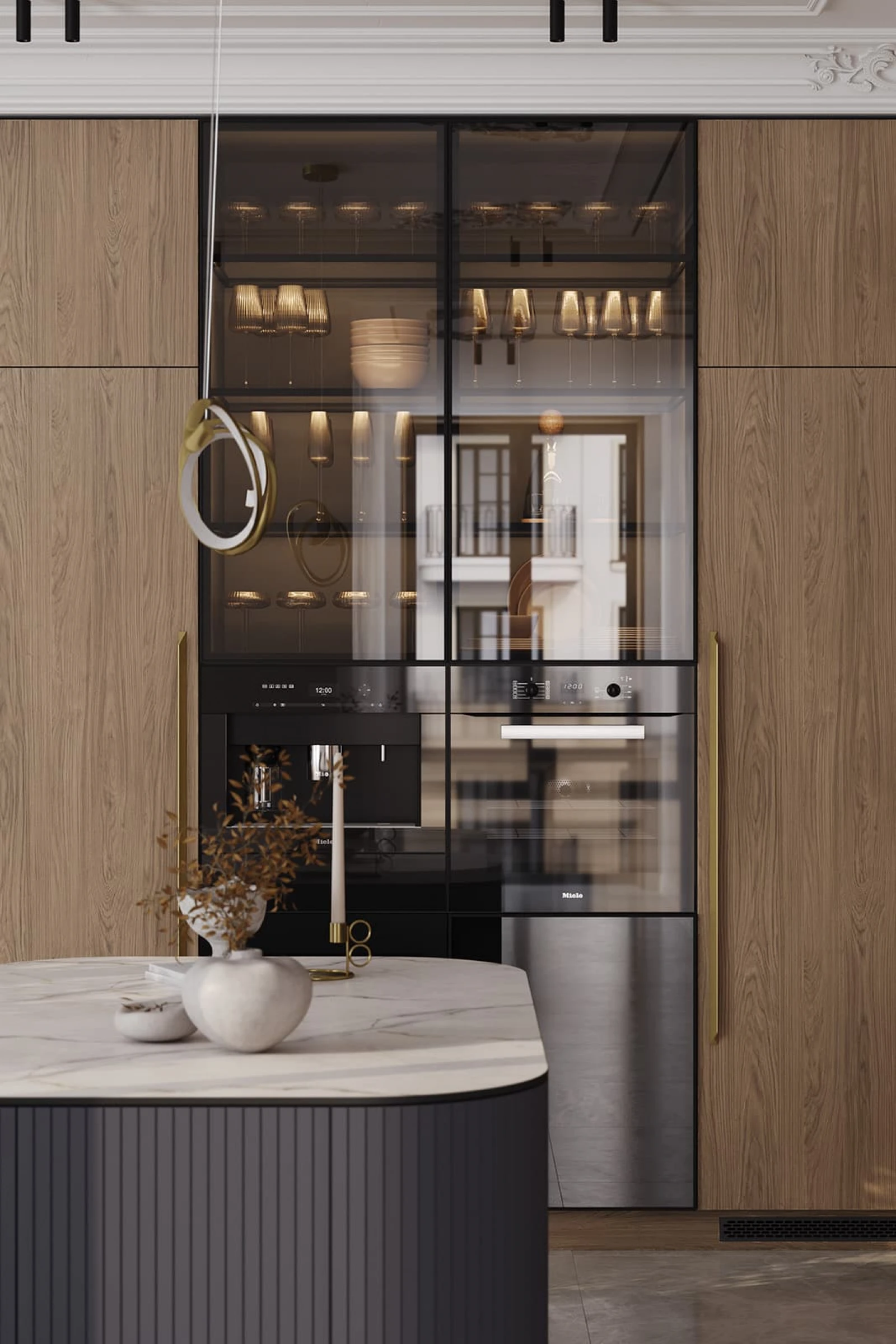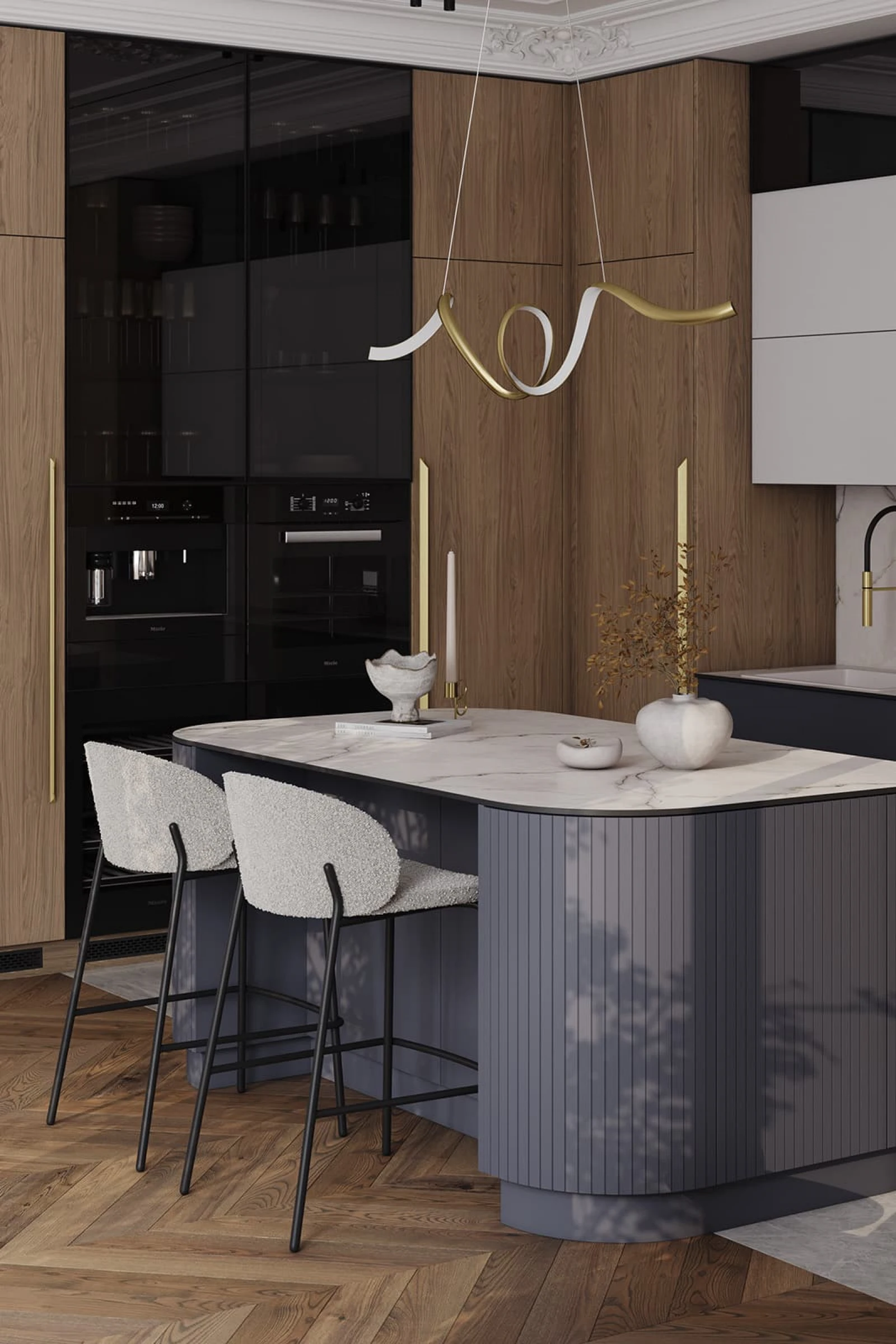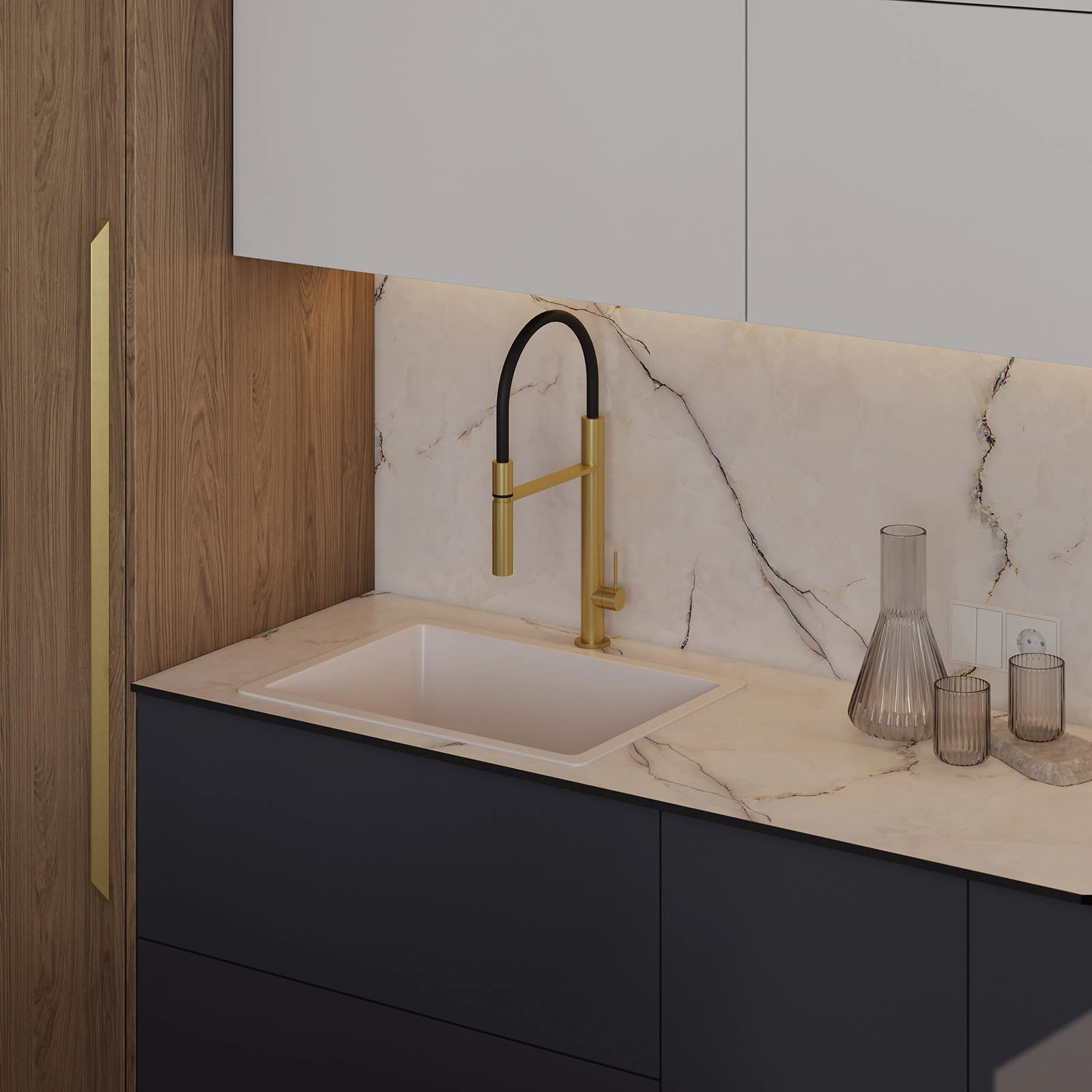 ФАСАДЫ ЛМДФ Тимбер, декор Каселла Коричневый / Аврора (крашеная МДФ), цвет NCS S 6010-R90B Матовый / крашеная МДФ, цвет NCS S 6010-R90B Матовый / NCS S 2000-N Матовый , СТОЛЕШНИЦА Компакт-плита, 12 мм, декор Миони