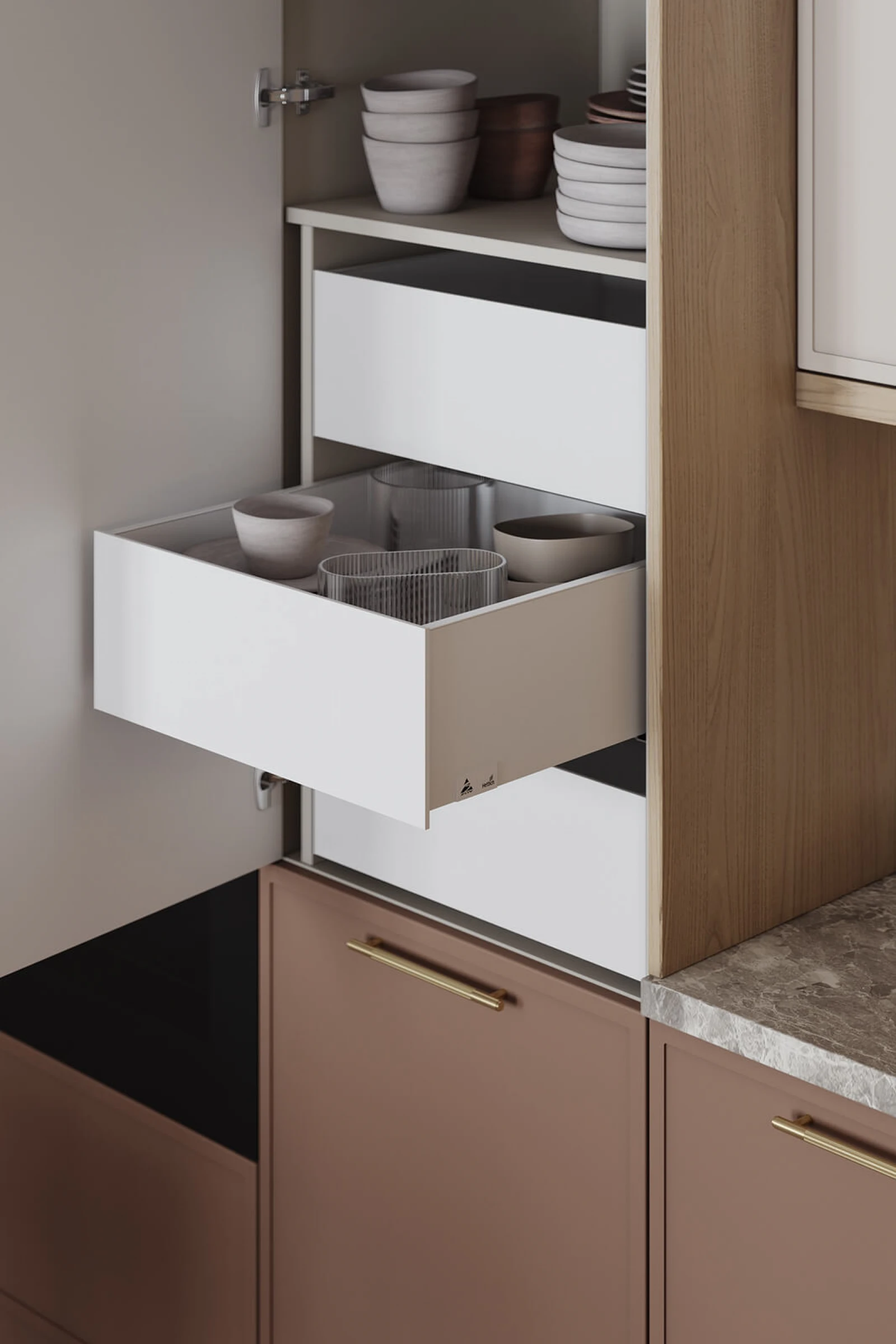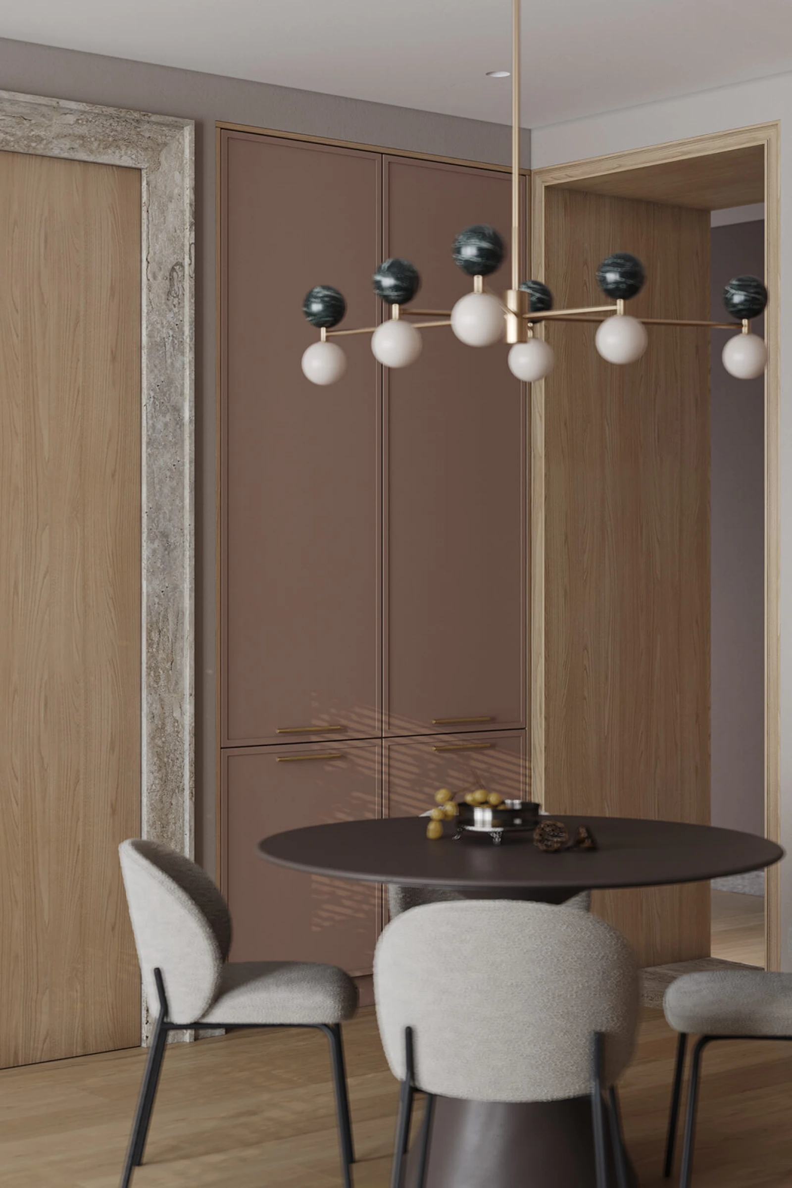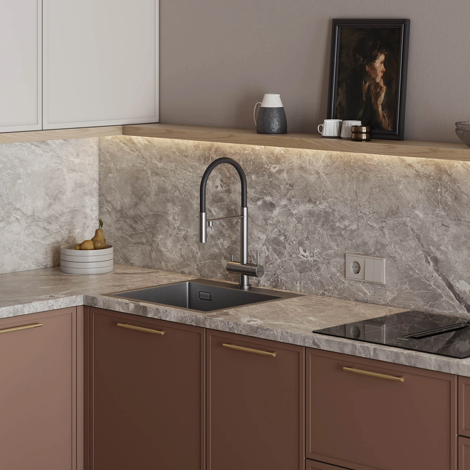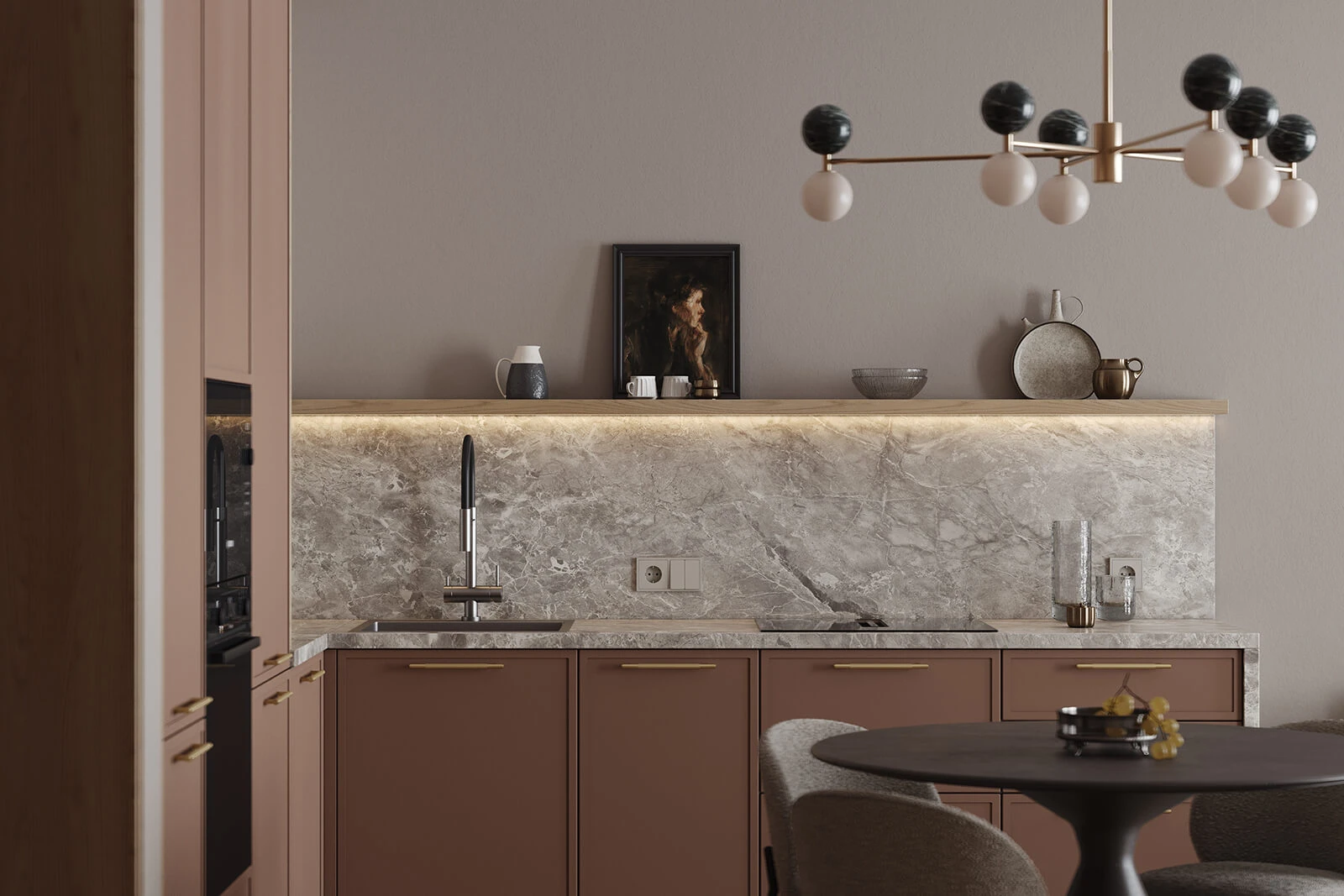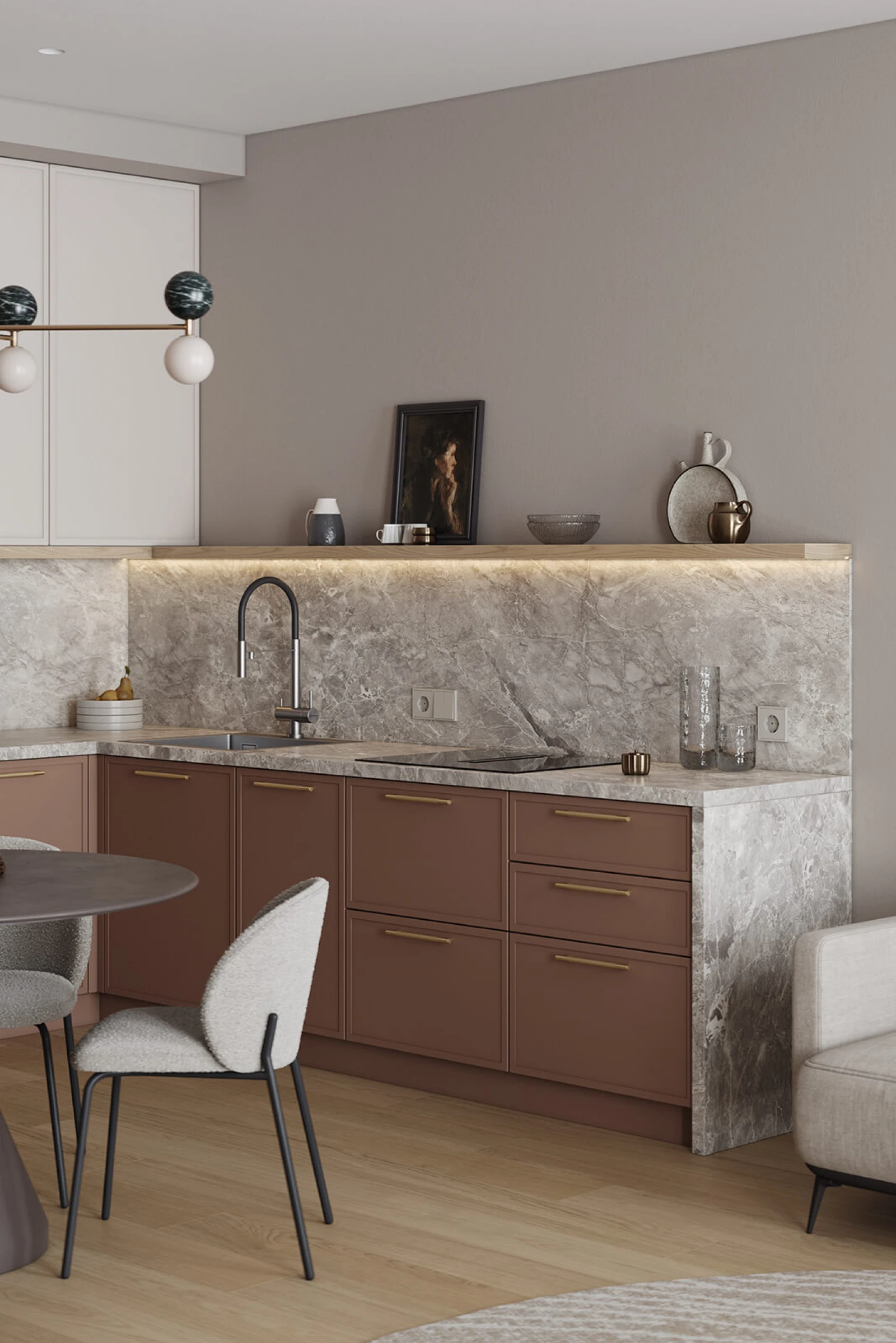 ФАСАДЫ Рокси (МДФ/ПВХ), цвет Мока / Морской Жемчуг, СТОЛЕШНИЦА Пластик HPL, 38 мм, декор Римский Камень