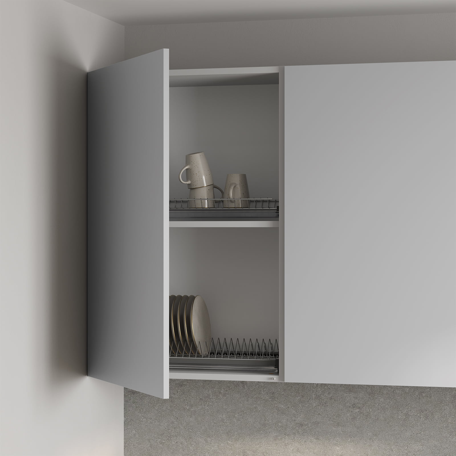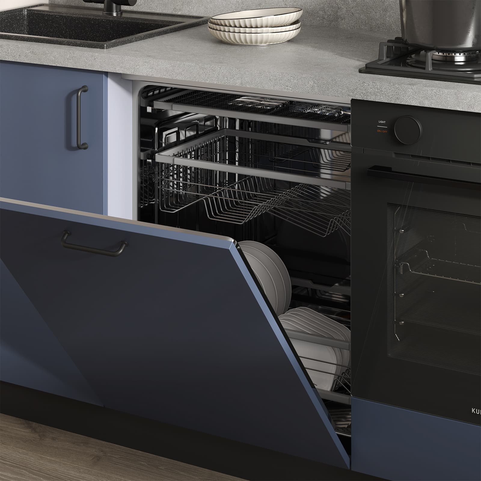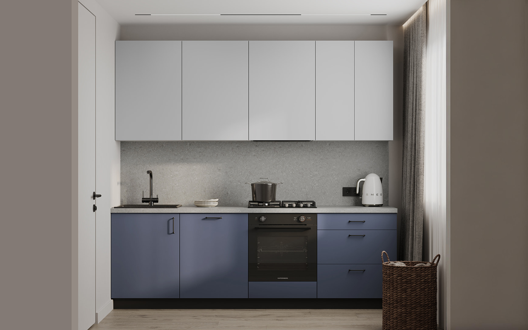 Фасады ЛМДФ EVOGLOSS, цвет Матовый Синий / Матовый Светло-серый, Столешница Пластик HPL, декор Ирвинг (толщина 38 мм, кромка ABS), Корпус ЛДСП 18 мм, цвет Серый Камень