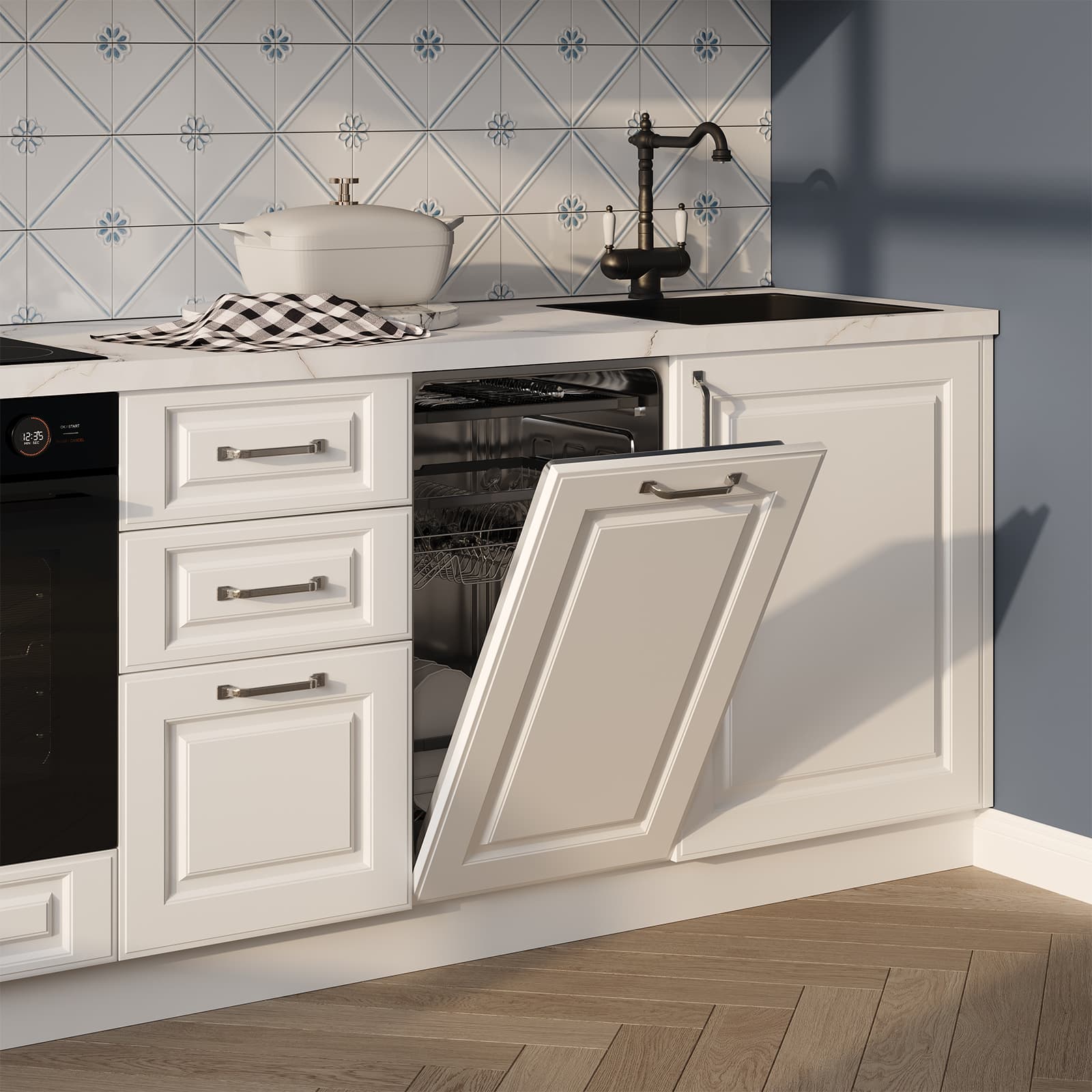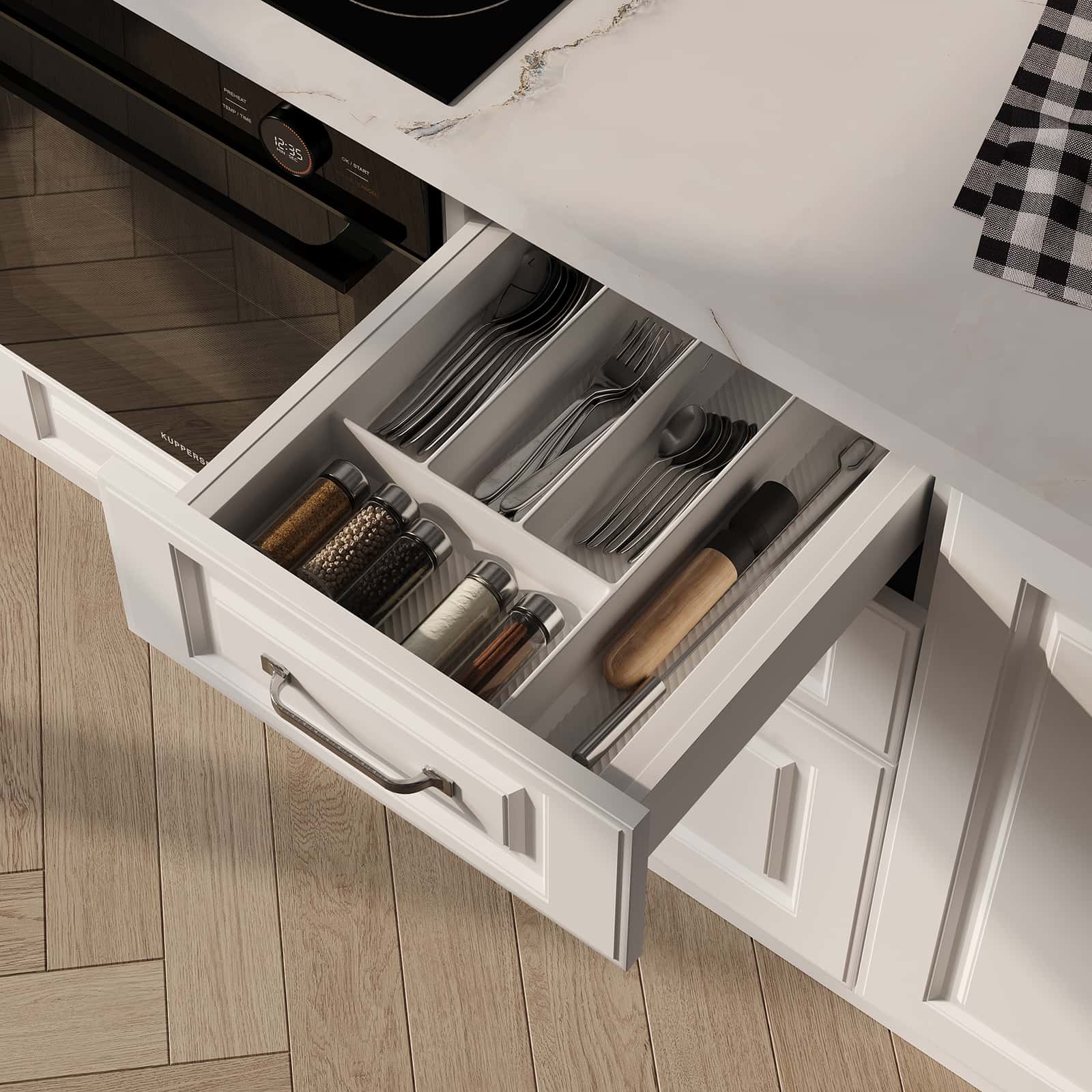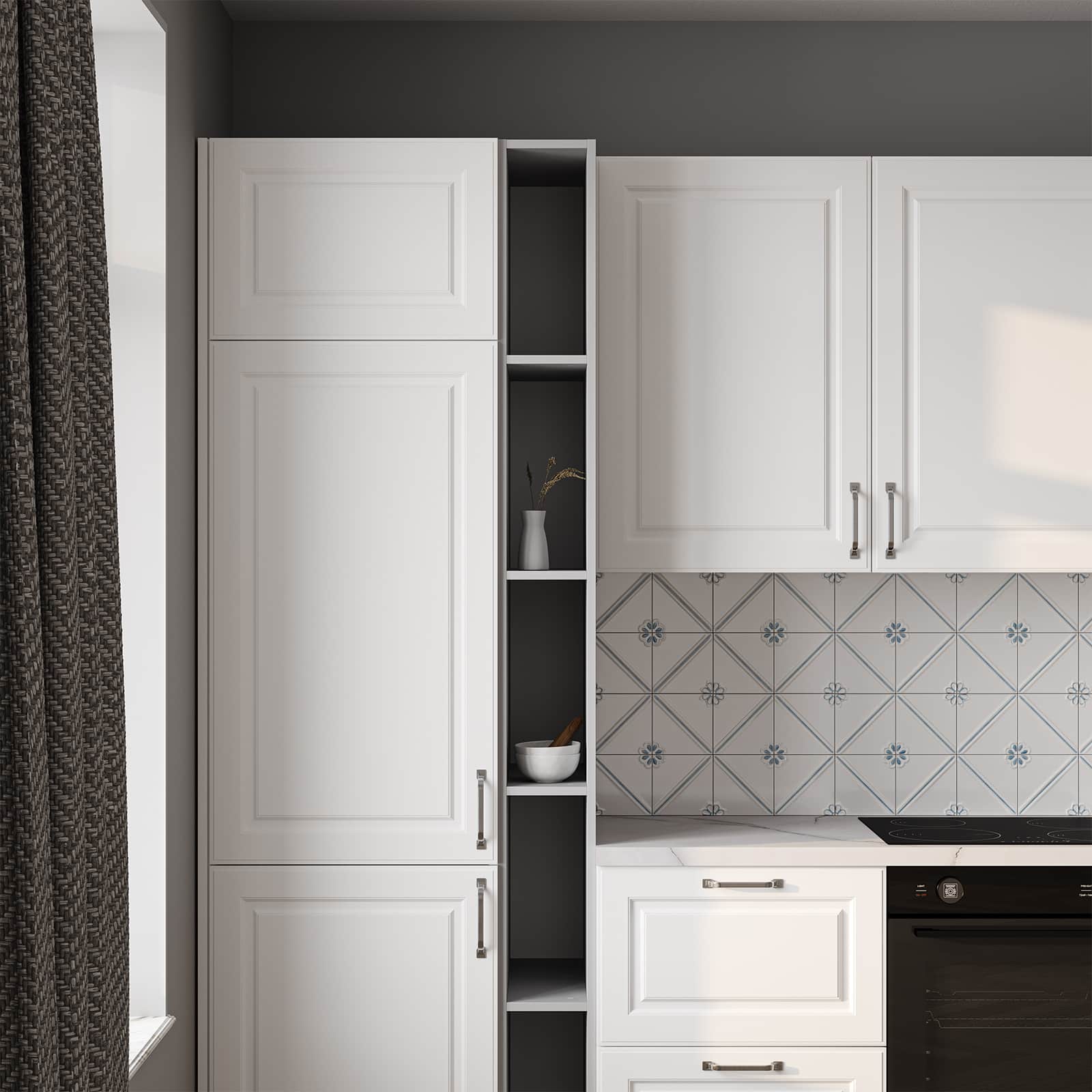 Фасады Темпо (МДФ/ПВХ), цвет Белый Матовый, Столешница Пластик HPL, декор Миони (толщина 38 мм, постформинг), Корпус ЛДСП, цвет Белый Премиум / Серый Камень (толщина 18 мм)