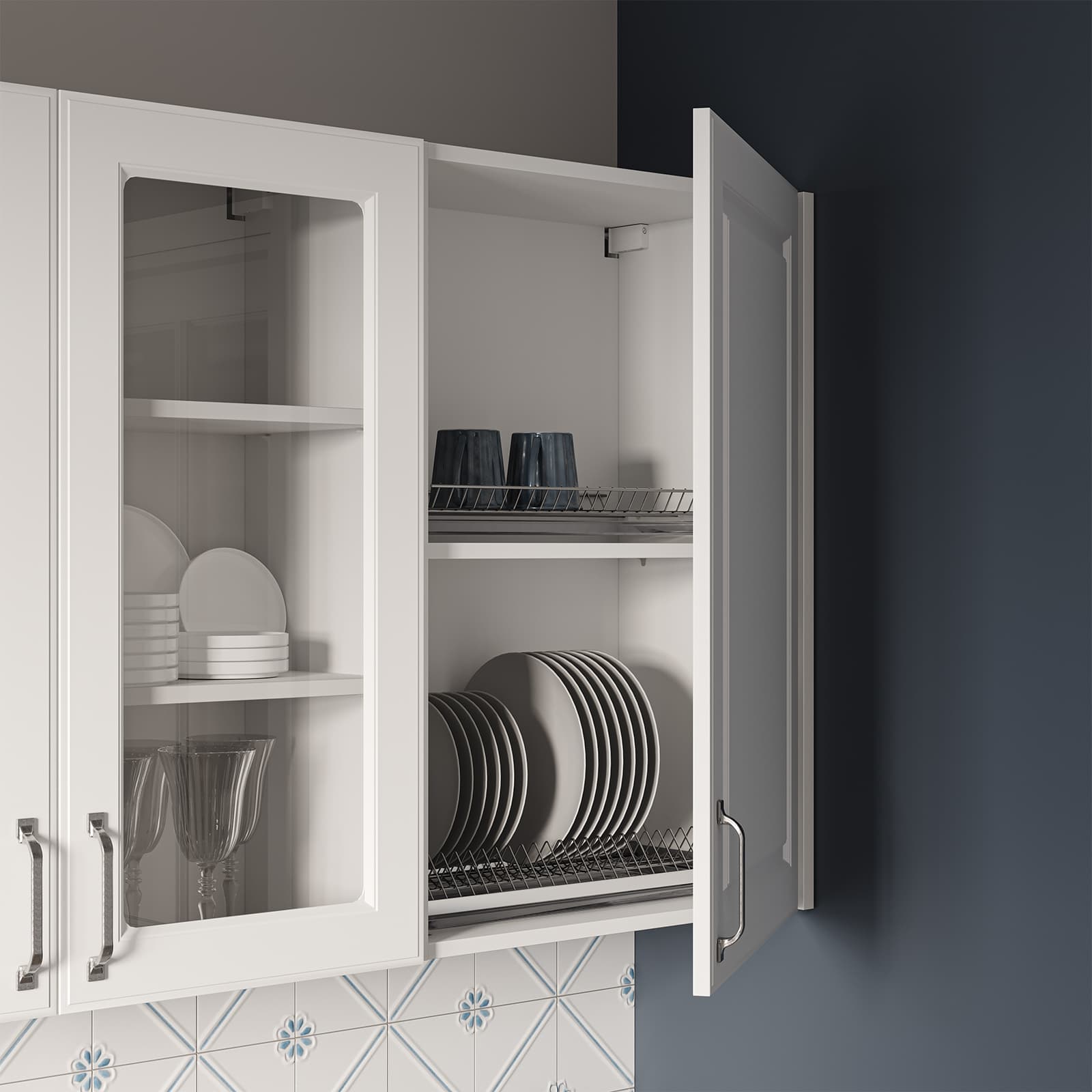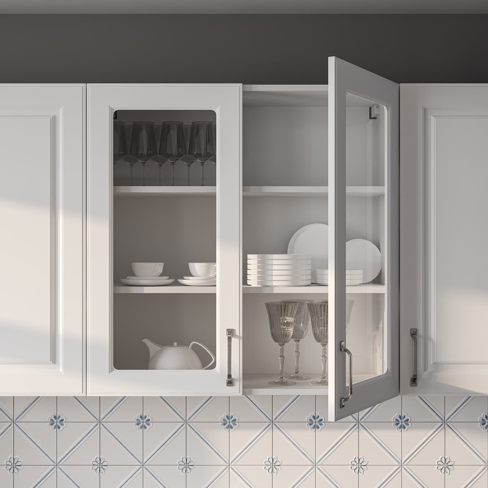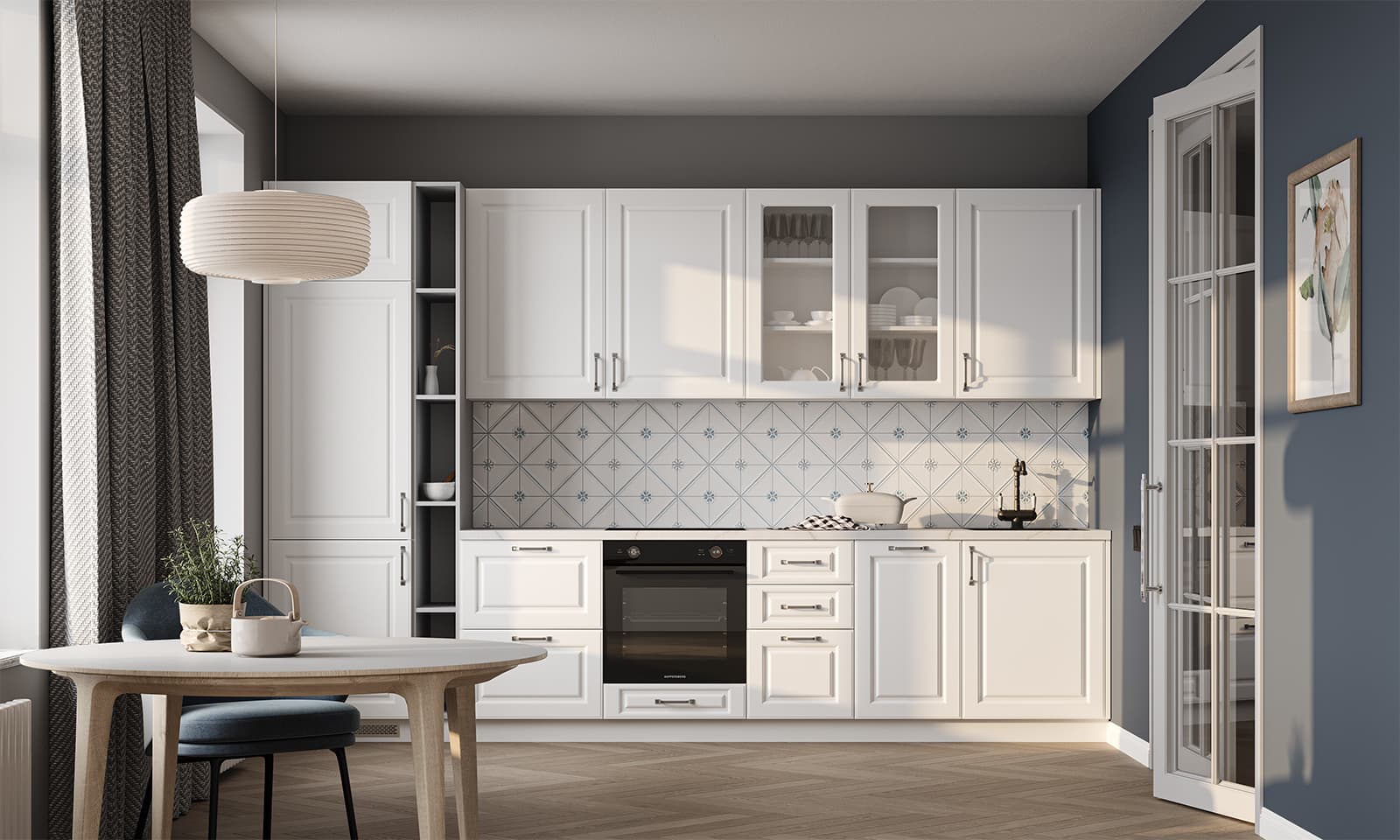 Фасады Темпо (МДФ/ПВХ), цвет Белый Матовый, Столешница Пластик HPL, декор Миони (толщина 38 мм, постформинг), Корпус ЛДСП, цвет Белый Премиум / Серый Камень (толщина 18 мм)