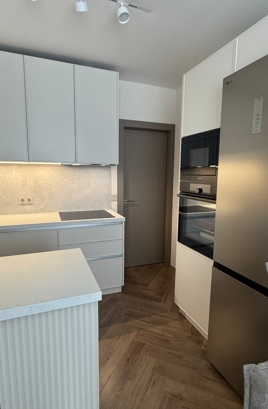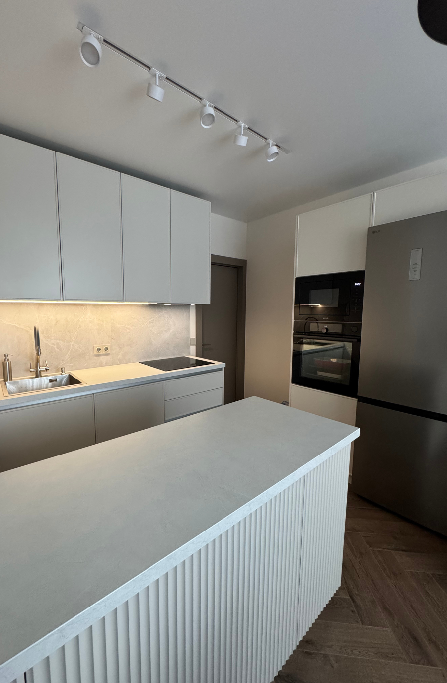 Минималистичная кухня в светлых тонах с древесной текстурой