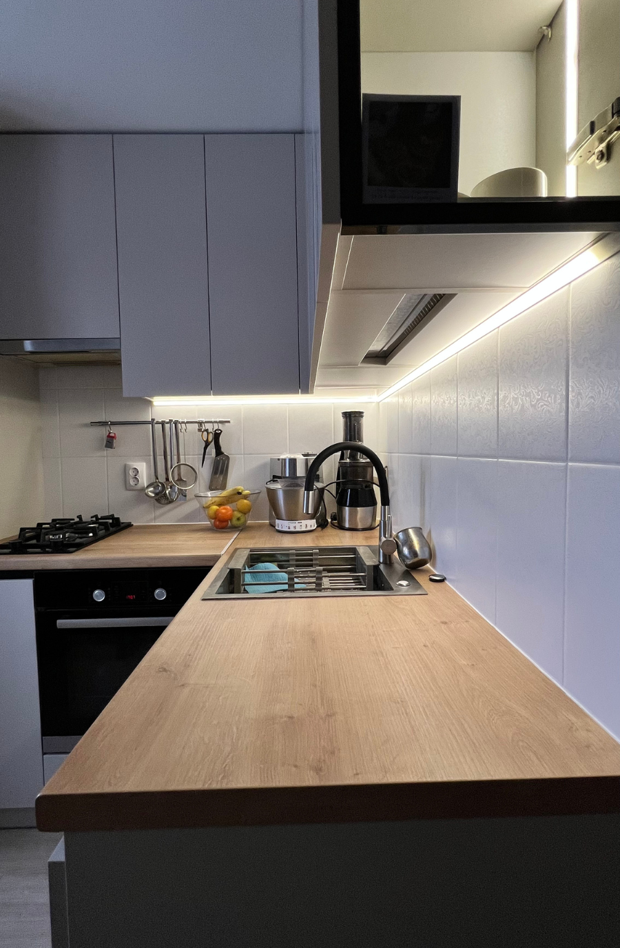 Минималистичная кухня в светлых тонах с древесной текстурой