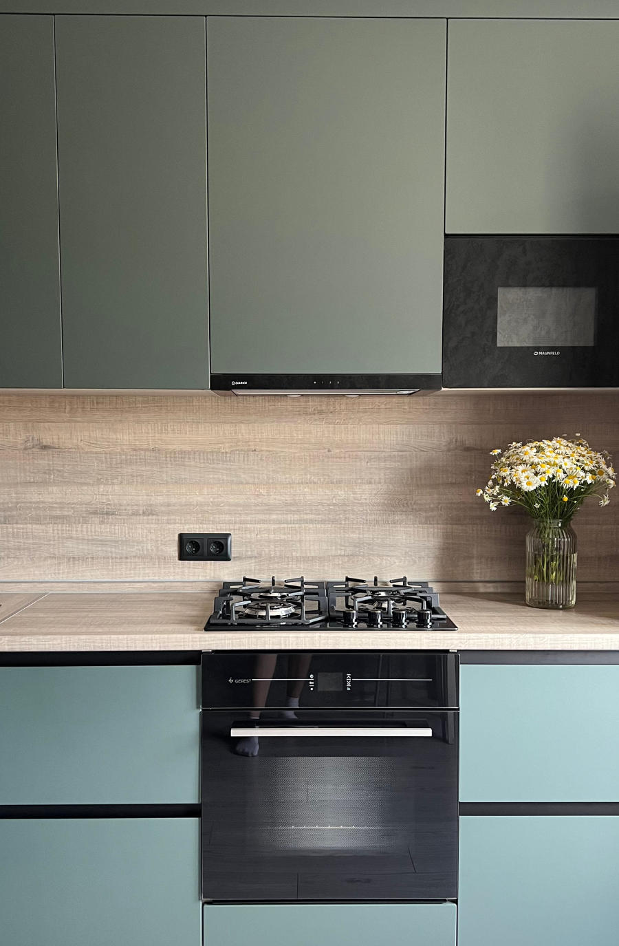 Минималистичная кухня в светлых тонах с древесной текстурой