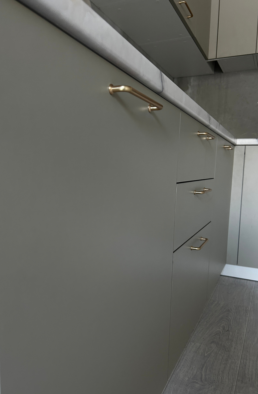 Угловая кухня на заказ в светло-сером цвете